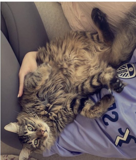 Han har en veldig lang hale, stripete på hele kroppen, sjeler litt med øynene. Han er ikke veldig langhåret, men litt, men halen ser veldig langhåret ut.