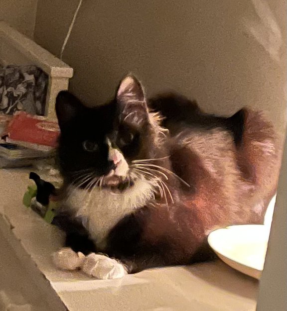 Sort, hvit tegning i ansikt og bryst. Alle fire poter er hvite. Lang hale. Halvlang pels, ikke flokete.
