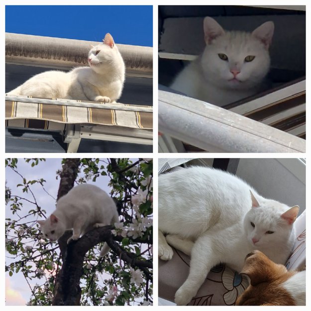 Helt hvit, men kan ha litt annen farge stedvis hvis han er møkkete - spesielt rygg. Noen lyse gule striper på hodet.