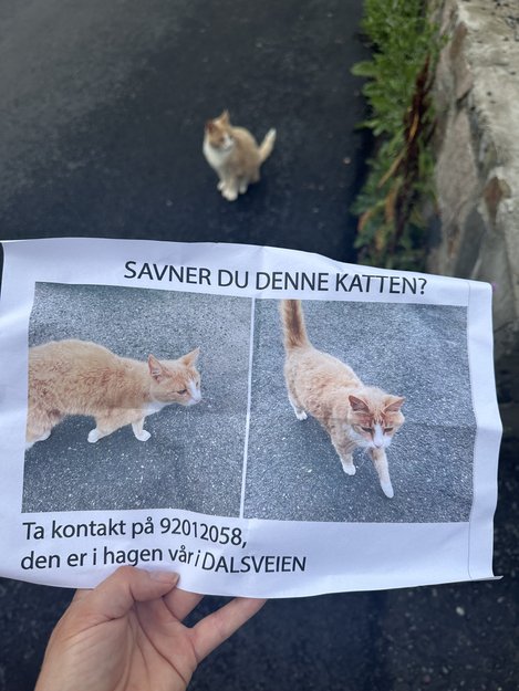 Oransje, eldre katt med hvit snute/bryst/poter observert i økende grad i Dalsveien/stasjonsveien.