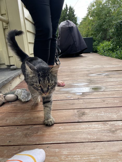 Kom mjauene inn i hagen vår. Kjempe sulten, tynn med noen sår ved venstre øre. Har vært hos veterinær og sjekket for chip uten hell.