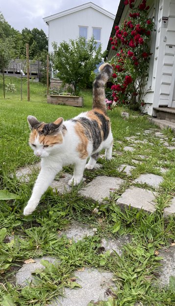 Katten på «ferie» hos kattepasser. Virket som den kanskje kunne hatt møte med annen katt eller orm. Ikke synlig men merkbart ubekvem og reagerte på å bli tatt på.