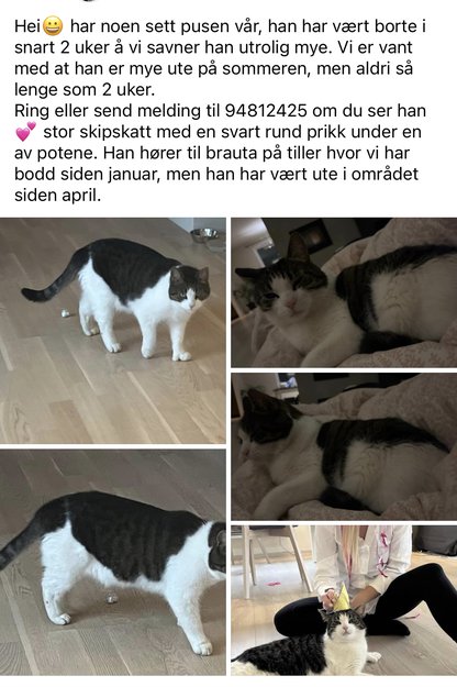 Katten ble funnet å hentet av dyrebeskyttelsen. De tok godt vare på han å leverte van til oss. Utrolig takknemlig for at han er hjemme nå.