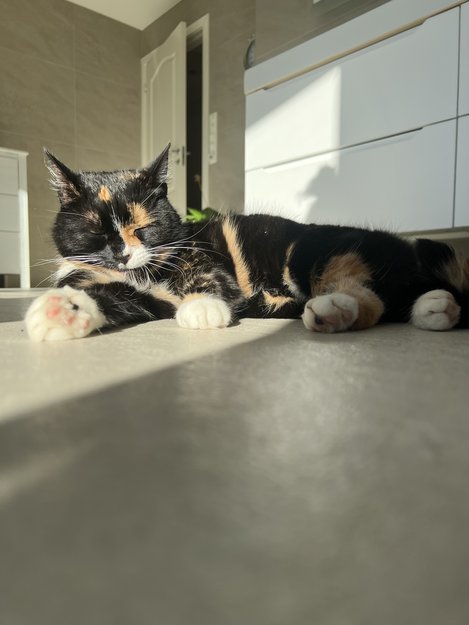 En meget sosial og menneskekjær pusekatt. Hun er mest svart med fint oransje og hvitt mønster (tricolor). Halve fjeser er mest svart og resten farger. Hvite poter (sokker)!