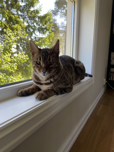 Sjeler med øynene. Pipete mjau. Bengalmønstret. Både sosial og sjenert. Lett skremt.