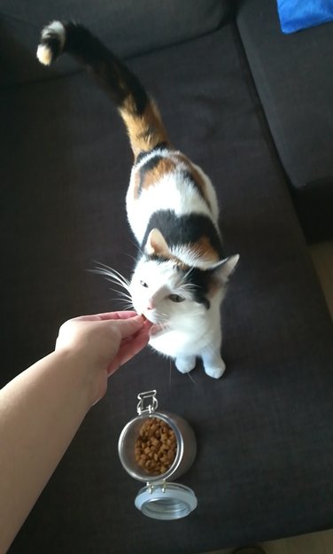 Korthåret, hvit med svarte og røde flekker, "vaskebjørn" på tuppen av halen, et synlig arr på høyre bakfot etter slåsskamp. Ca 4 kg, sterilisert med lilla/rosa halsbånd med Id.