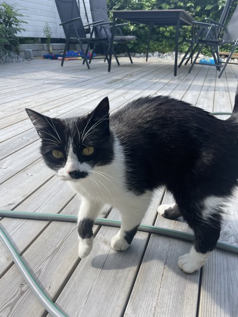 Har funnet denne katten sovende i sofaen vår ute i hagen flere dager på rad. Nå har vi vært bortreist i en uke, men da vi kom hjem var den der igjen.