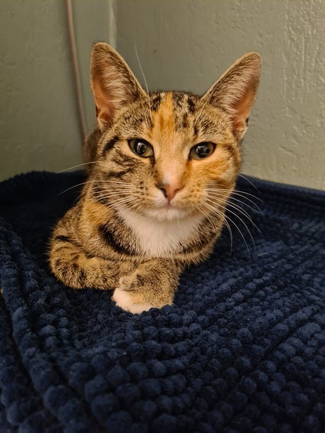 Ung hunnkatt, ikke chippet. Tricolour med striper, oransje flekker og hvite labber og bryst.