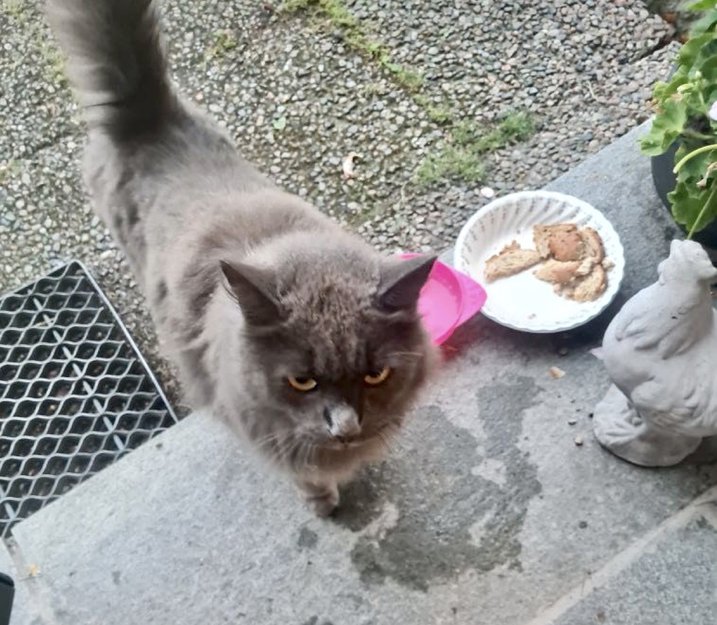 Langhåret, grå katt funnet i Anholtområdet. Fulgte etter oss hjem og har vært utenfor huset vårt siden.