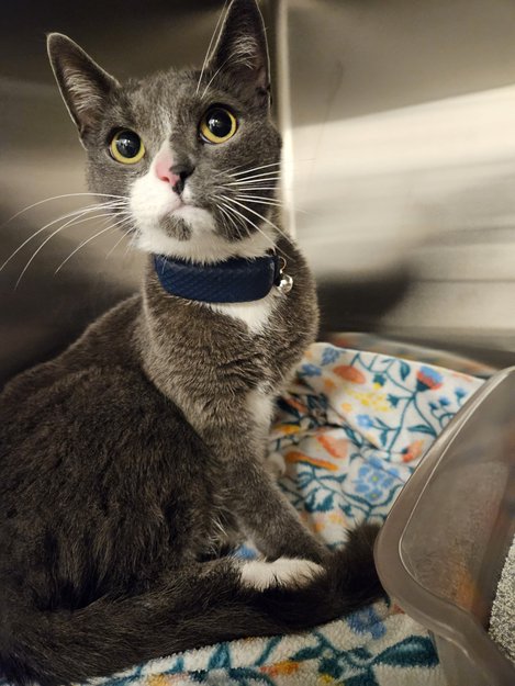 Tofarget grå, hvite poter, hvitt bryst og delvis hvitt ansikt. Ung hannkatt, kastrert (mest sannsynlig). Halsbånd med bjelle og noe som ligner en gps. Klare, gule øyne. Snill og kontaktsøkende. Slank.