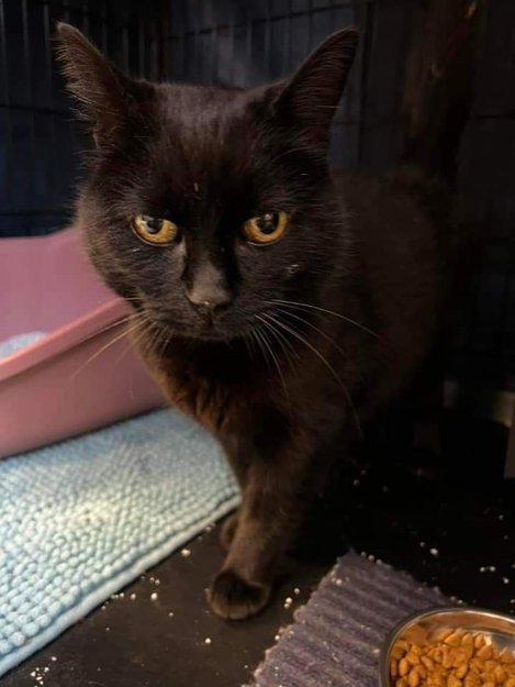 Helsvart, normal i hold. Noe brunt i de gule øynene. Veldig trygg og kosete pus.
