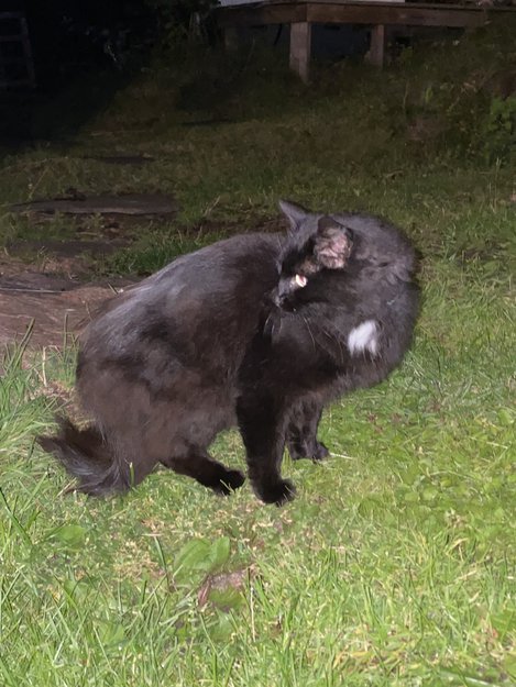 Katt som er utenfor hytta. Har Flått-halsbånd. Sort og Langhåret med litt hvitt under haka.
