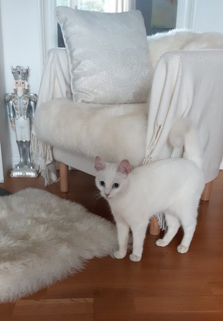 Helt hvit, lik farge på begge øynene, isblå. Ingen chip eller id-merke. Hunnkatt, ung, tynn, men ikke syk, tre kg. Vandt med mennesker.