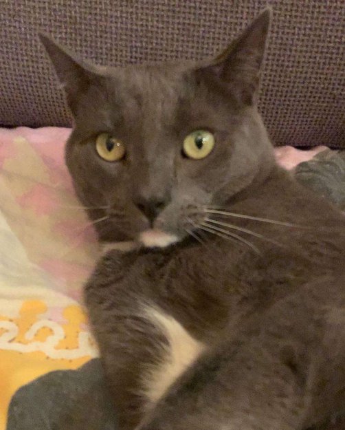 Hovedsakelig grå, men hvit på mage, potene og under hake/hals. Kosete, tam.