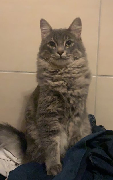 Simba er en 1 år gammel nysgjerrig og sosial hannkatt. Han er svært kontaktsøkende og pratsom. Har semilang gråmelert pels, litt hvit under haka og stor fluffy grå hale.