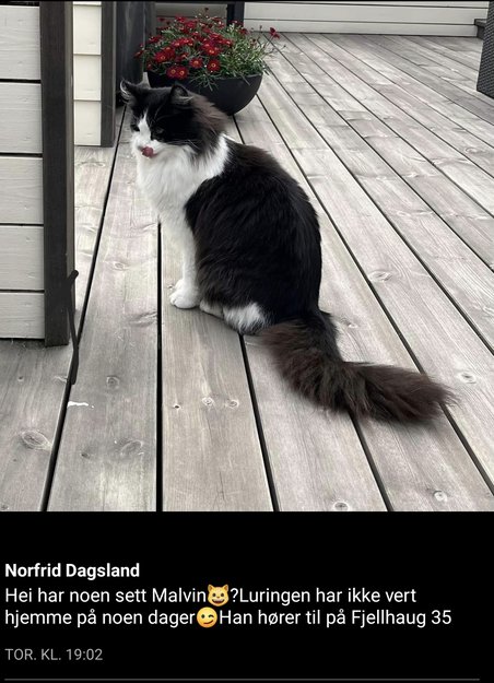 Svart, hele brystet og føtter hvite og hvit rundt nakken.
