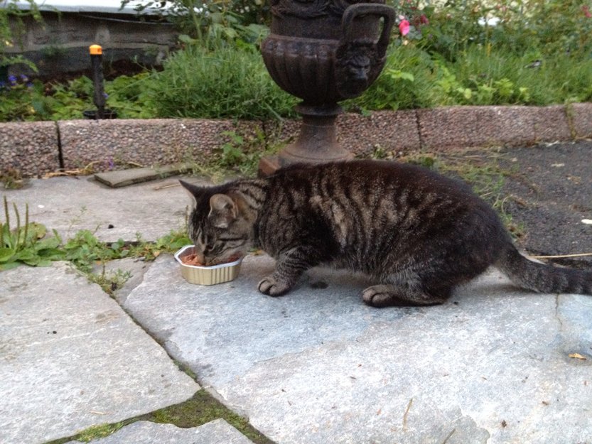 Katten kommer til huset nesten daglig og oppholder seg rundt huset i lengre tid, har nå gjort dette i en lengre periode. Katten kommer ofte hvis døren åpnes eller det kommer biler til huset. Den sover også ofte uten for inngangsdøren.