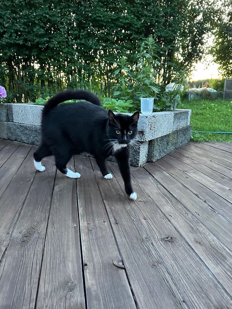 Katten har vandret rundt her siden mai. Kastrert hann katt, veldig kosete. Men nekter og forlate tomten vår