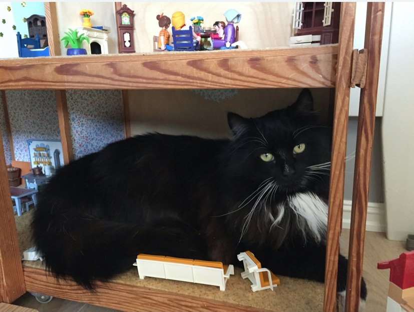 Ludwig er en hannkatt på to år. Han er kosete og veldig glad i mat. Han har langt pels, hvit på potene, brystet og magen, og resten er svart. Han er glad i mennesker, og veldig kontaktsøkende. Hodet hans er svart, med noen få hvite hår på nesa