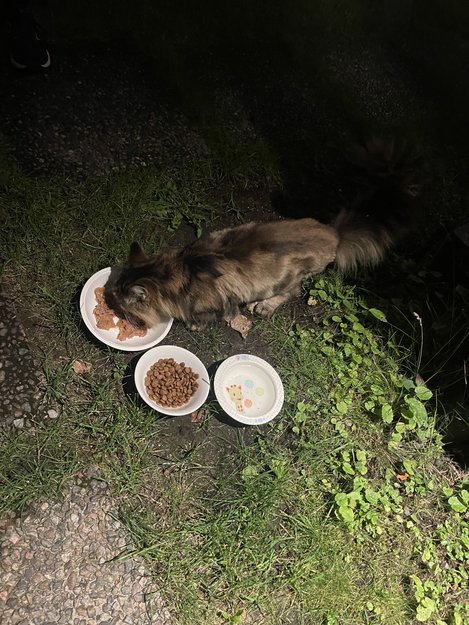 Veldig avmagret katt - henger her hos meg. Har fått kattemat