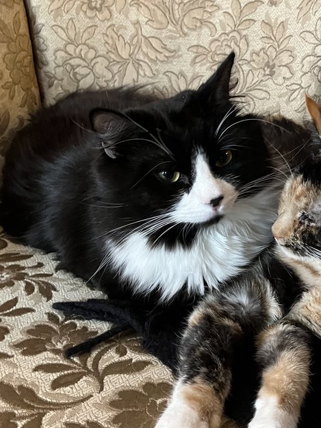 Svart langhåret katt, med hvit pels rundt munn, mage og poter. Han har gule øyne som lyser langt unna, og svart på nesen. En veldig snill katt, men som oftest redd fremmede og lyder.