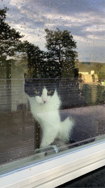 Sort og hvit to-åring. Kastrert hannkatt. Sort prikk på snuten og en karakteristisk hvit flekk på ryggen. Han er chippet, og registrert på oss.