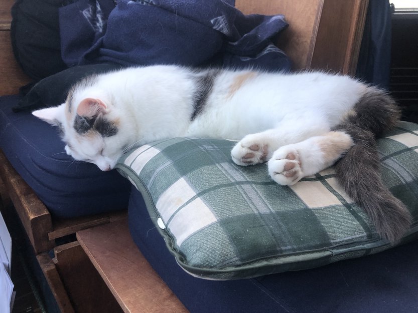 Mia er mest hvit, har noen brune og svarte tegninger, og halen er spraglete.