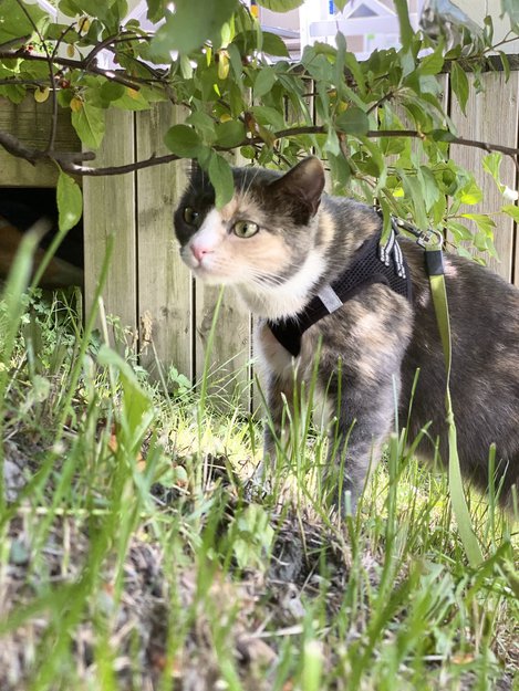 Hun var halvmåne i ansiktet. Grå på den ene siden og brun på andre. Lytter til navnet Luna og Pus.