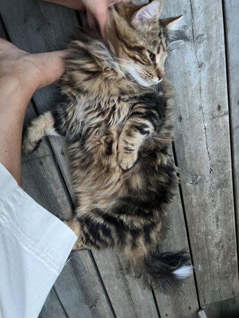 Ukjent katt som går rundt og søker oppmerksomhet i nærområdet. Veldig kosete og vil inn. Virker sulten. Har ikke halsbånd.