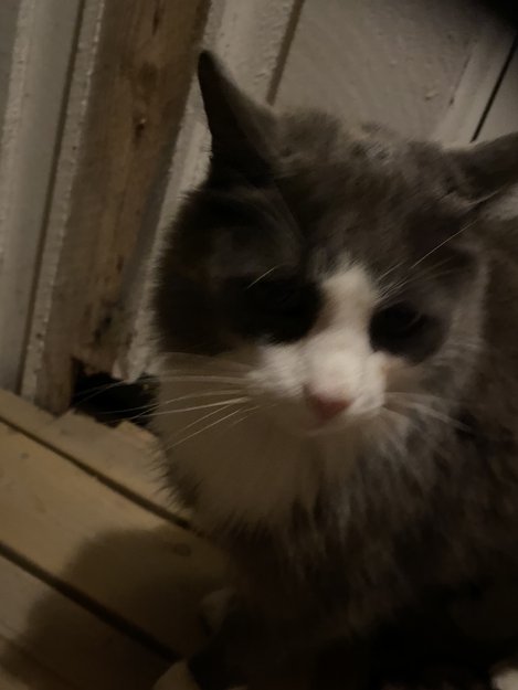 Kjempesøt katt har hatt tilhold på gården nonen dager. Er litt skeptisk, men er kosete,sniker seg inn til meg og spiser av skålene til mine puser (til deres forargelse😅.). Er i godt hold.