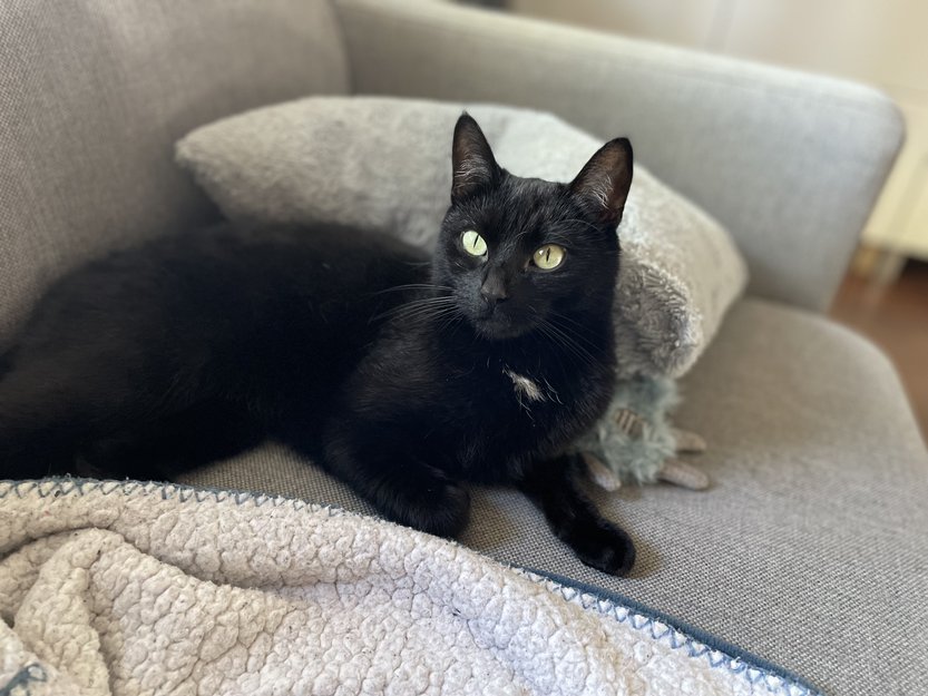 Pus er sort med hvit flekk på halsen. Den har noen hvite områder på magen og mellom bakbeina