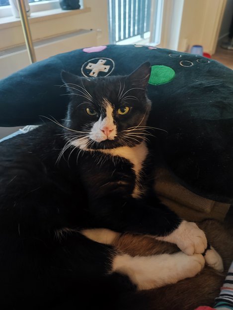 Tuxedo katt med litt hvitt på ansiktet. Ikke kastrert.
