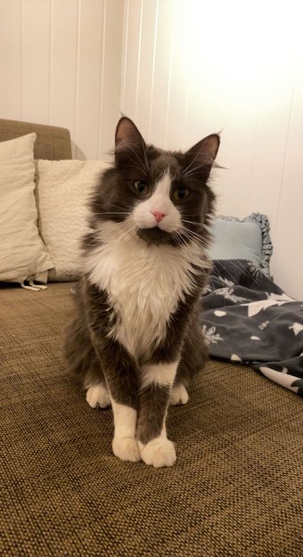 Langhåret, grå og hvit, 2år, litt stor og tam men veldig skvetten. Kan være litt vill i blikket.