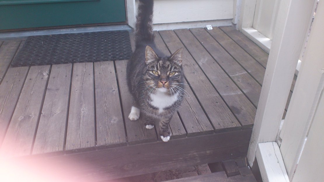 Den sitter utenfor i Hagen og vil inn til alle naboer. Hun virker tillitsfull og kjælen. Men synes det er litt rart at den vil inn hele tiden. Hun er litt tynn.