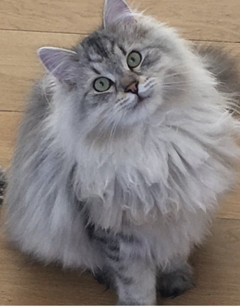 Katten er grå og hvit . Litt engstelig av seg . Store poter .