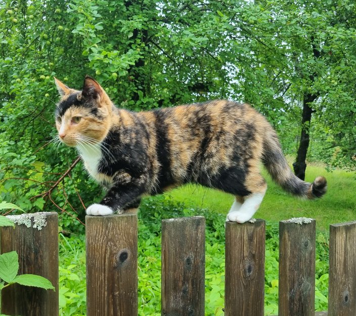Hun er ca 5 år gammel, og ganske liten av vekst. Hun er tricolour, men mest svart og brun/oransje.