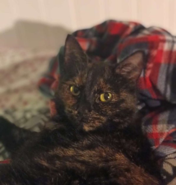 For det meste svart med litt brun her og der. Helt gule øyne og litt mager med kort pels.