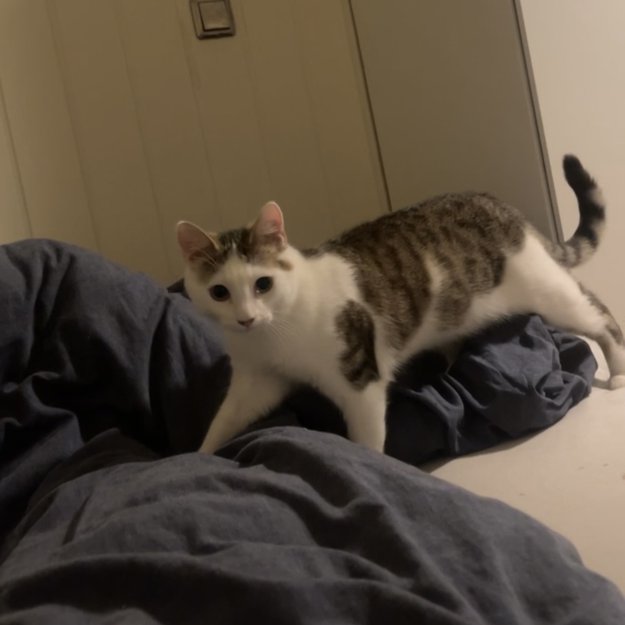 Veldig symmetrisk mønster over hode, fargen utenom det hvite er gråbrun. Han er ute for første gang på egenhånd, og han er veldig skeptisk til andre mennesker han ikke kjenner grunnet en hard oppvekst før han ble funnet av Kattehuset.