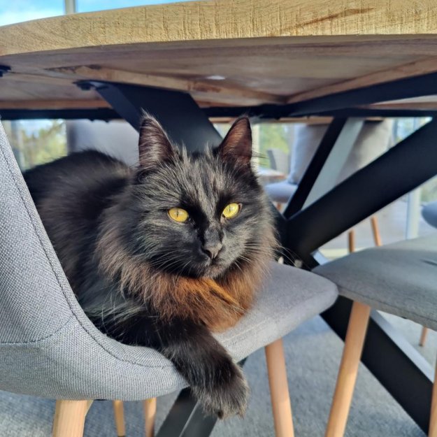 Sort semilang pels med noen brunere områder. Noe hvitt i pelsen på brystet. Gule øyne. Buskete hale. Har på seg et grått flåtthalsbånd. Slank og "liten" hannkatt. To år gammel. Ikke gatas skrekk, men litt "sjenert" og skeptisk. Kan klatre i trær og gå på hustaket.