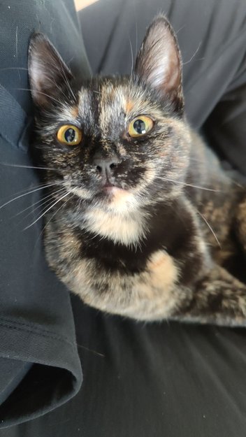 Skilpaddefarget med en oransje tå foran. Mye hvitt under haka. Liten i størrelsen.