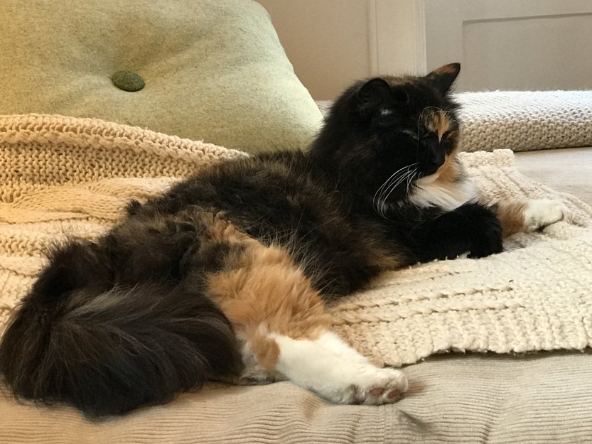 Stor hunnkatt. Veldig kosete. Lyder navnet.