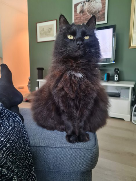 Hun er langhåret og sort, og har en hvit flekk på brystet. Ingen hakk i ørene, og noen hvite værhår. Hun har mye ekstra hud på magen, så har skikkelig hengemage. Hun er gammel, og har ikke mye muskelmasse under all den pelsen.