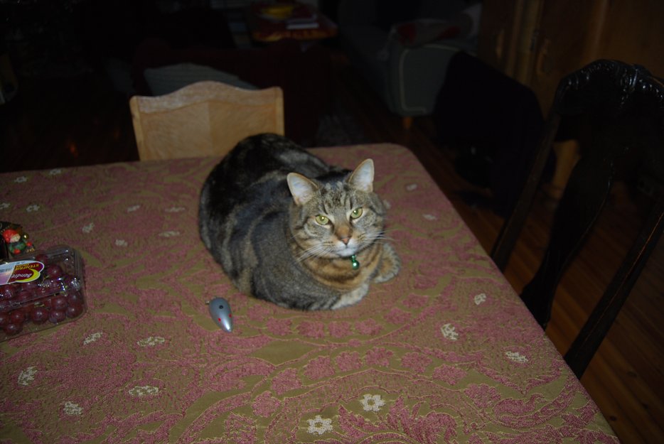 Han er kastrert og har derfor litt slapp mage (mage som henger). Han er brun-rød på magen og brystet. Han er korthåret og ser litt tabby-mønstret ut. Litt grå i ansiktet med et par svarte striper. På ryggen er han svart og brun-grå. Han har gul-grønne øyne. Han lyder navnet sitt og er generelt ganske kosete. Han har halsbånd med bjelle hvor det står navn og addresse (halsbåndet kan ha falt av). Han er 9 år.