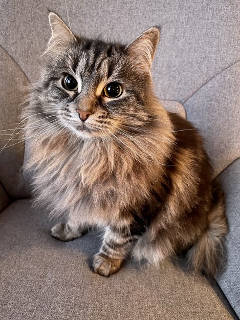 Lys grå/hvit på undersiden. Grå og brun brede striper på oversiden. Liten (3 kg), 5 år.