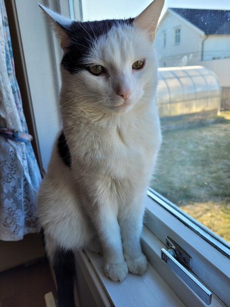 Hvit katt med svart hale og "hår". Han er vanligvis redd for fremmede.