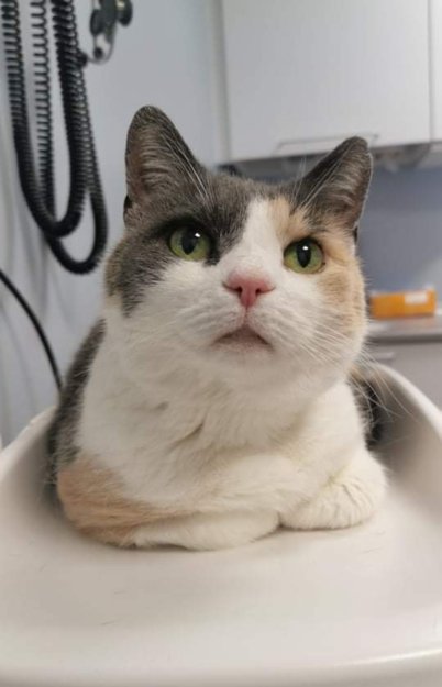 Hun er tricolor, grå hvit og oransje. Hun har grønne øyne.