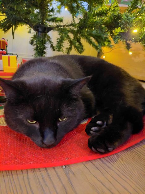 Svart katt med noe hvite hår på bryst og mellom bena. Han elsker dreames