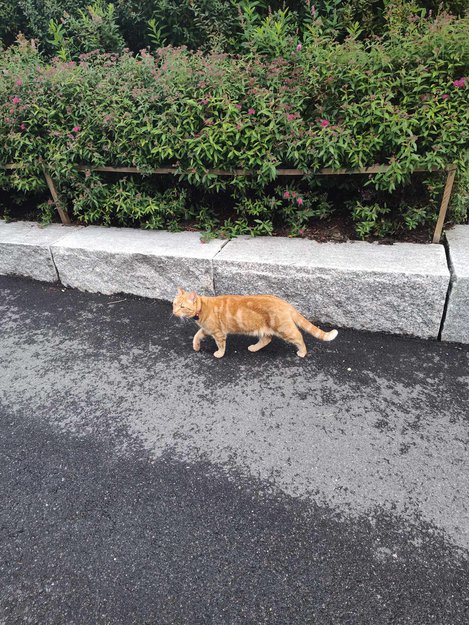 Denne katten har et rødt bånd i nakken.Denne katten holder på dette stedet og det var ikke lett å ta med til veterinæren fordi han stakk av.