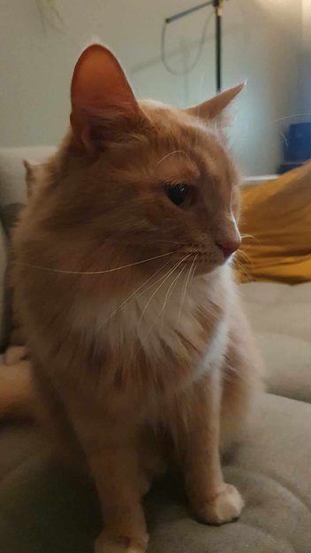 Har en høy hvit "sokk" på høyre bakben. Rød flekk i venstre øye. Lang pels. Er skeptisk til fremmede og vil nok ikke søke kontakt - men kan selvsagt bli sjarmert med mat.