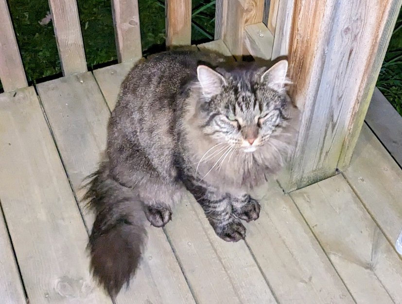 Katten står utenfor verandadøra og mjauer hver kveld/natt. Meget kontaktsøkende og tillitsfull. Vil inn i leiligheten.